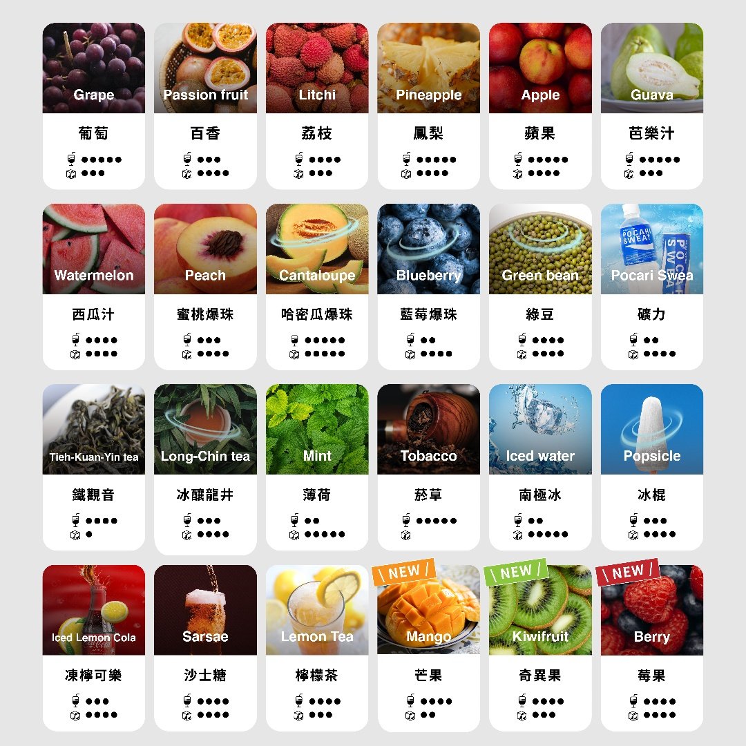 | 顏色及口味 | 電泳白, 天峰藍, 丁香紫, 寶石綠, 鐵鉛灰, 午夜黑, 葡萄, 百香, 荔枝, 鳳梨, 蘋果, 芭樂汁, 西瓜汁, 蜜桃爆珠, 哈密瓜爆珠, 藍莓爆珠, 綠豆, 礦力, 鐵觀音, 冰釀龍井, 薄荷, 煙草, 南極冰, 冰棍, 凍檸可樂, 沙士糖, 檸檬茶, 芒果, 奇異果, 莓果 |